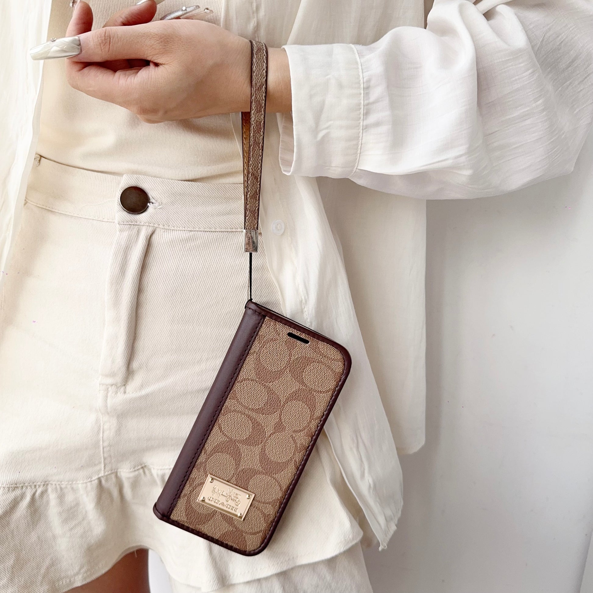 This leather fold CH iPhone case with wallet and strap combines luxury and practicality. Crafted from premium leather, it offers card storage, reliable protection, and refined elegance inspired by Coach’s latest design.