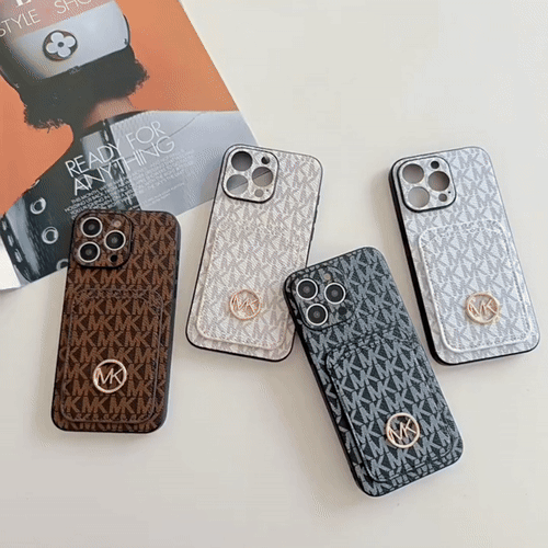This brown leather MK iPhone case offers luxury and function. Features a stylish MK design. built-in card holder. and shockproof protection for elegant and secure use.